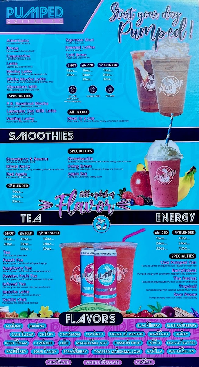 At Pumped Coffee Co. Menu, you’ll find a delightful variety of options perfect for any time of day. Whether you’re stopping by for a quick pick-me-up or settling in for a relaxing afternoon, the menu offers something for everyone. Start your day with one of their rich, expertly brewed coffees, or if you're in the mood for something different, try their unique iced beverages or smoothies. For those looking for a bite, the selection of freshly made pastries and savory options will hit the spot. Located at 7067 Skyway in Paradise, CA, this cozy spot is the ideal place to unwind, savor delicious flavors, and enjoy a friendly, laid-back atmosphere. With each menu item crafted to please, it’s clear why this place is a local favorite.